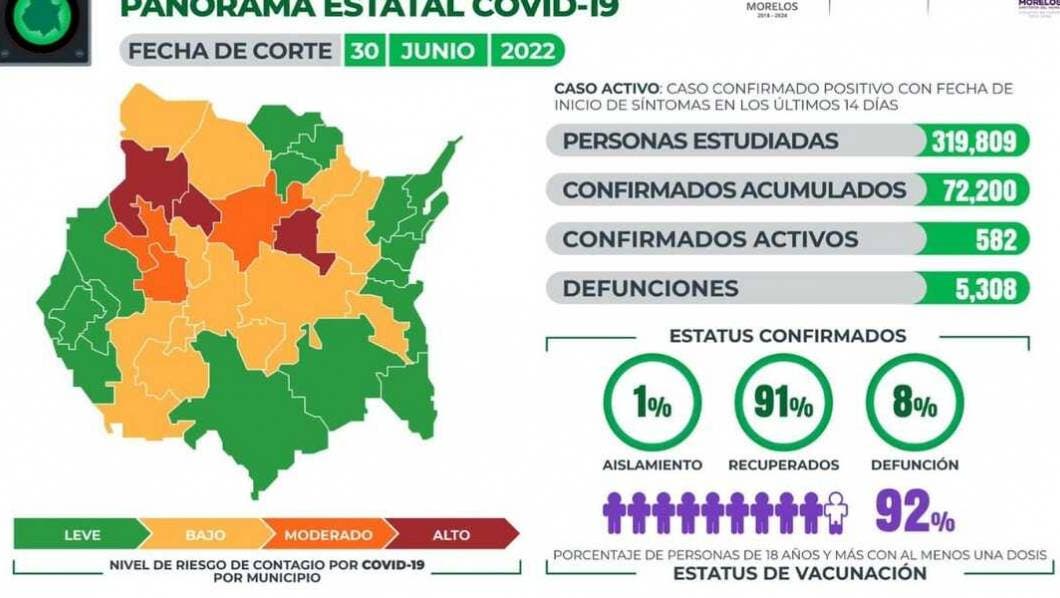 La Secretaría de Salud informa que a la fecha en Morelos se han estudiado 319 mil 809 personas, de las cuales se han confirmado 72 mil 200 con coronavirus COVID-19; 582 están activas y se han registrado 5 mil 308 defunciones.
