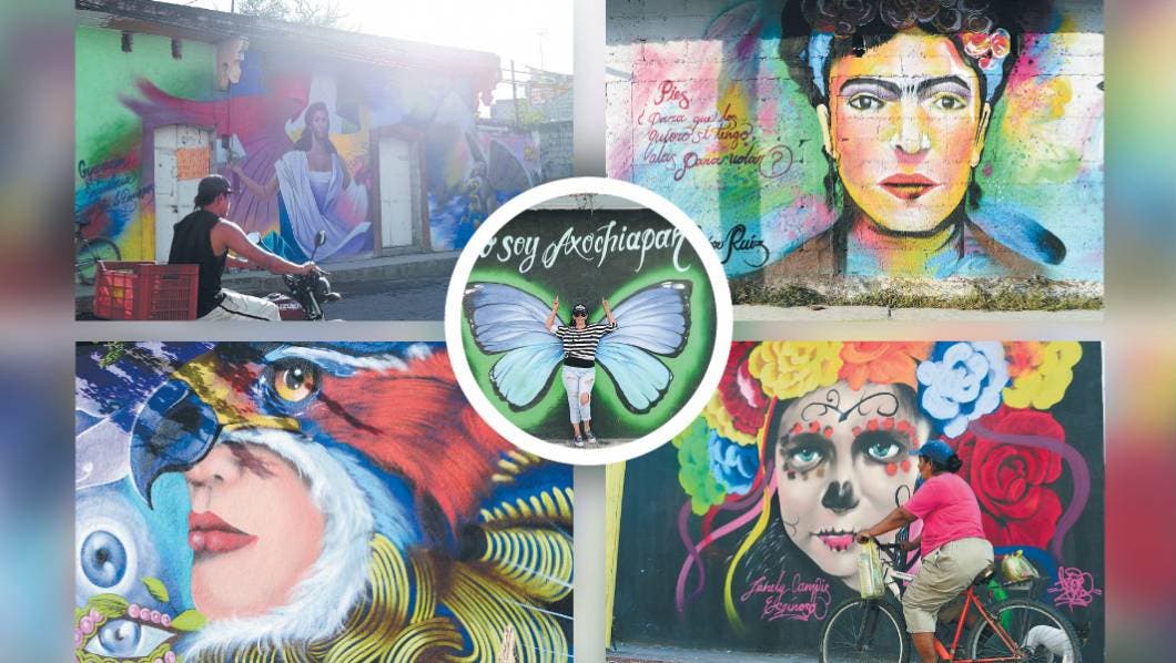 Tal vez a simple vista no se aprecien los numerosos murales que envuelven y llenan de magia y color a Axochiapan, pero una vez que los miras y te dejas atrapar por ellos, sin duda alegran la vista. En ellos podemos observar a Zapata, Frida Kahlo, Diego Rivera, Quetzalcoatl, el Tecuán, mensajes, como el famoso “amor y paz”; alas de ángel o mariposa, para la fotografía del recuerdo, hasta fachadas de casas que se han vuelto las más populares entre los habitantes.