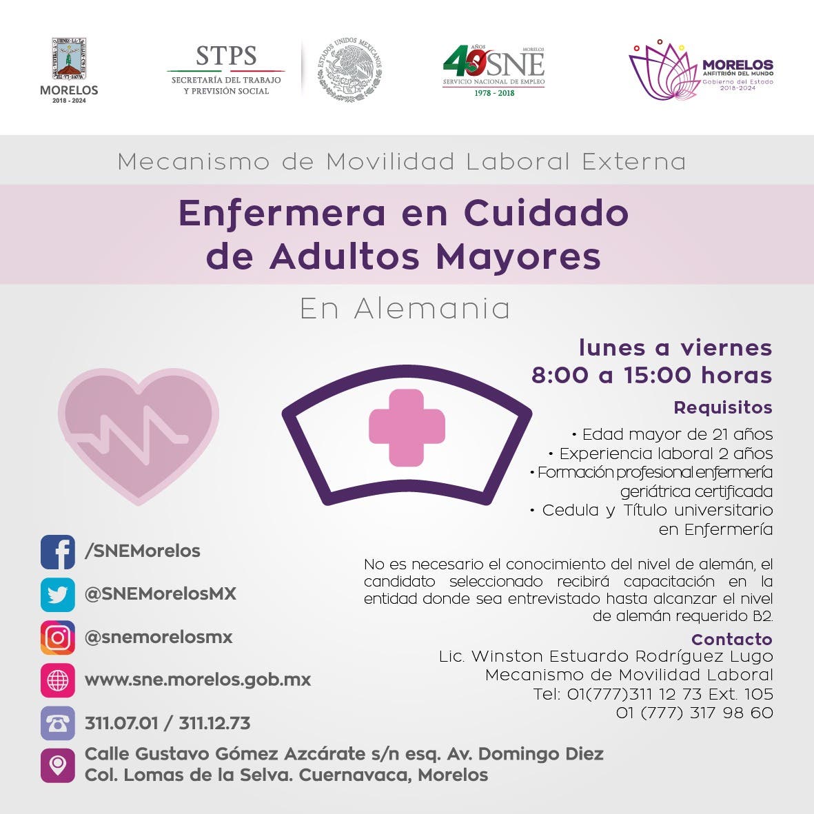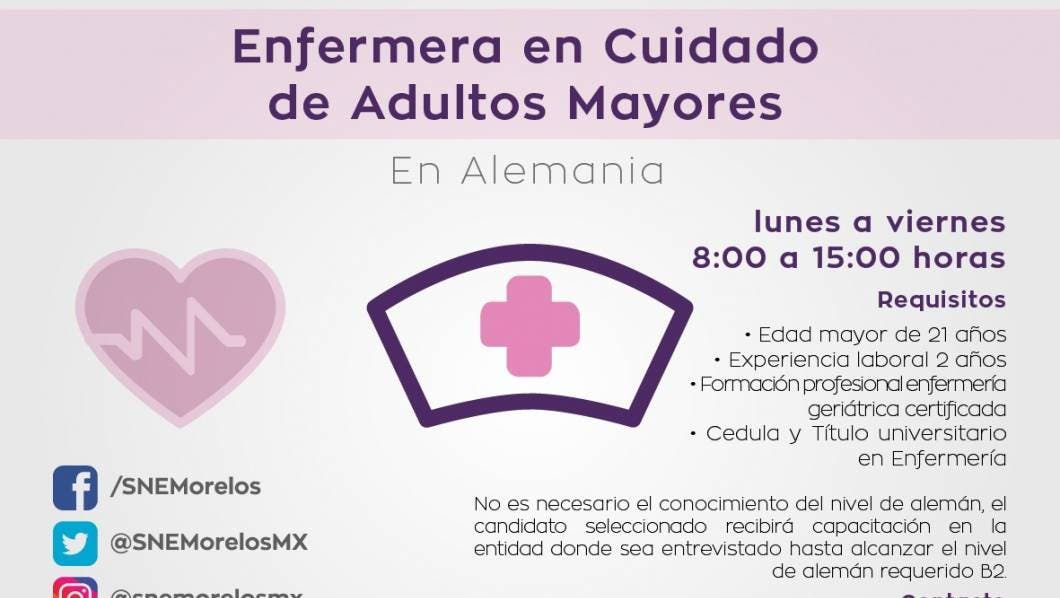 El Servicio Nacional de Empleo (SNE) Morelos, a través del mecanismo de Movilidad Laboral Externa, oferta 150 vacantes para enfermera certificada en cuidado de adultos mayores para trabajar en Alemania, con sueldos que oscilan entre los 22 mil (504 mil pesos) y 27 mil euros anuales (619 mil pesos)