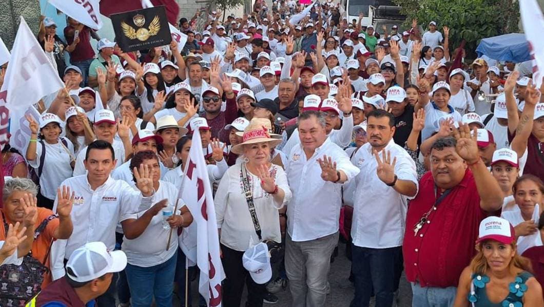 Posterior a una caminata, la cual inició en la periferia de la cancha de usos múltiples y concluyó en la calle Farabundo Martí, los abanderados de MORENA encabezaron un mitin en donde compartieron su plan de trabajo para legislar y dar atención al servicio de agua potable.