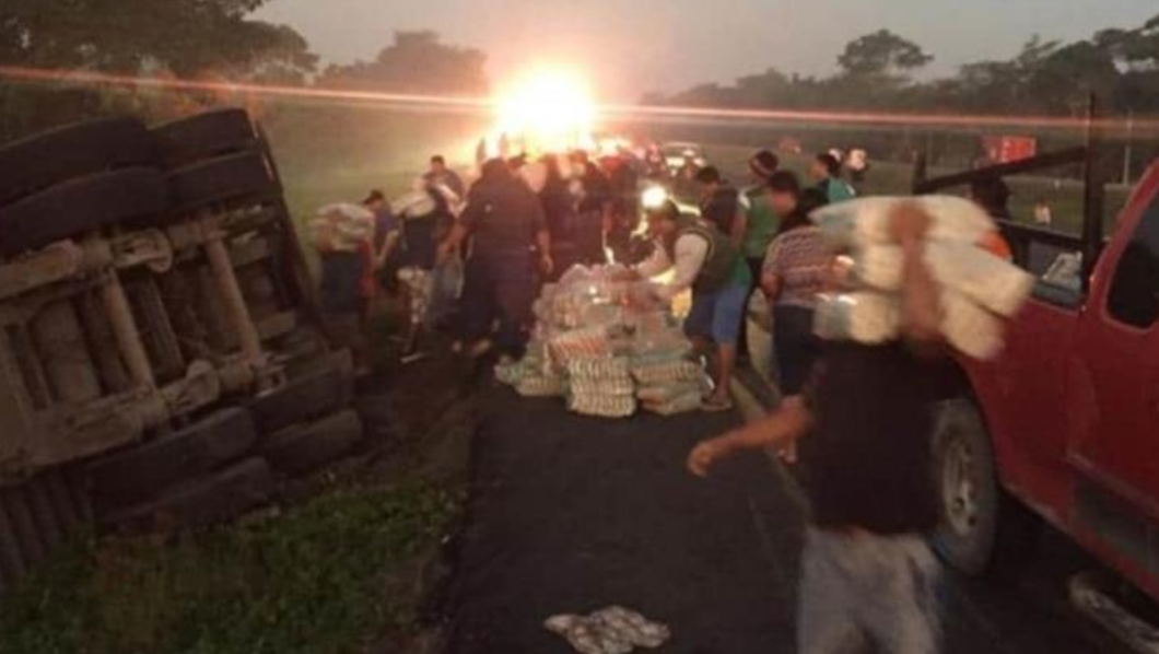 En minutos, pobladores de Cárdenas, Tabasco, vaciaron un tráiler cargado con arroz que se volcó esta mañana sobre la autopista Villahermosa-Coatzacoalcos.
