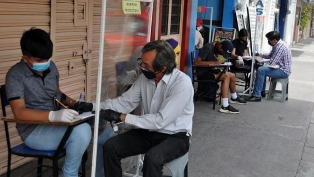 Con alumnos en la banqueta y detrás un acrilico, el profesor Raymundo Hernández Hernández, de 61 años, continúa dando clases en Cuautla, pese a los contagios por COVID-19.