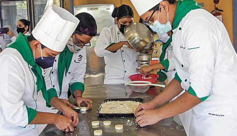 Los alumnos de ambas instituciones prepararon una ensalada de pera con queso, acompañada de un aderezo de mostaza y miel, así como la preparación de un mazapán artesanal.