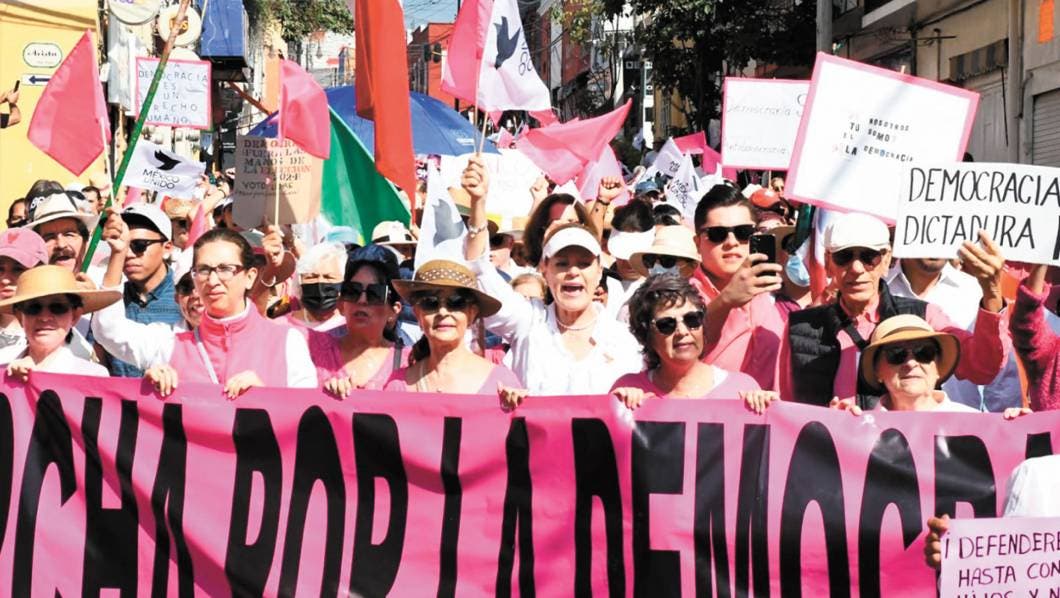 Simpatizantes del movimiento “Marea Rosa” y del “Frente Cívico Nacional” participaron en la llamada “Marcha por la Democracia”, este domingo 18 de febrero, en el Centro Histórico de la capital morelense.