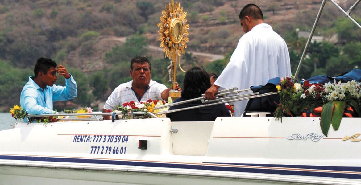 Al llegar a mitad del lago de Tequesquitengo, en donde se encuentra sumergida la iglesia original del pueblo, se hizo una oración y después se depositó una ofrenda floral.