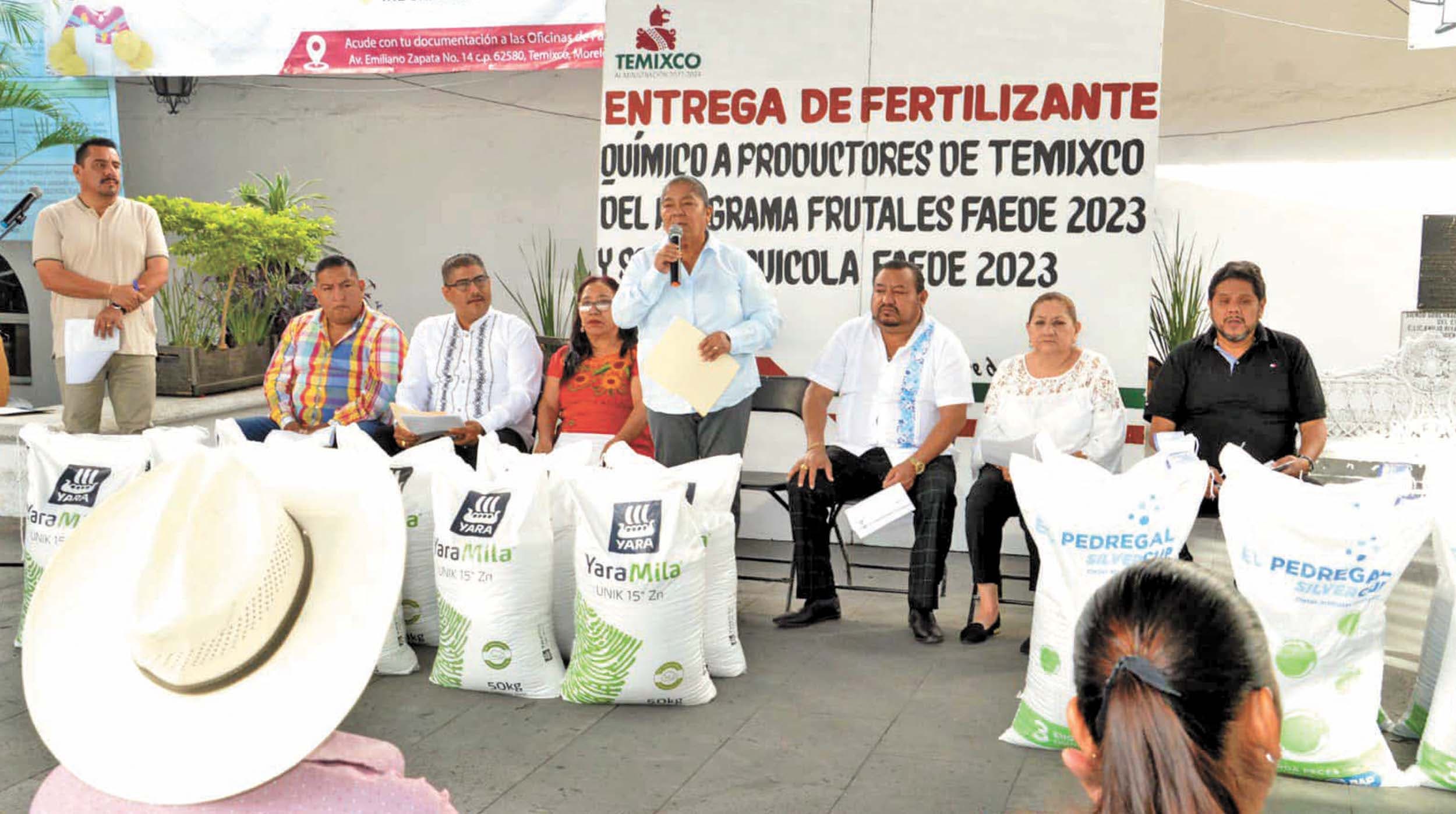 La presidenta municipal de Temixco,Juanita Ocampo Domínguez,en compañía del síndic omunicipal, Andrés DuqueTinoco,e integrantes de Cabildo y Gabinete,encabezó la entrega de fertilizante químico a productores de cítricos y del sector acuícola, ambos del Fondo de Aportaciones Estatales para el Desarrollo Económico (FAEDE) 2023.