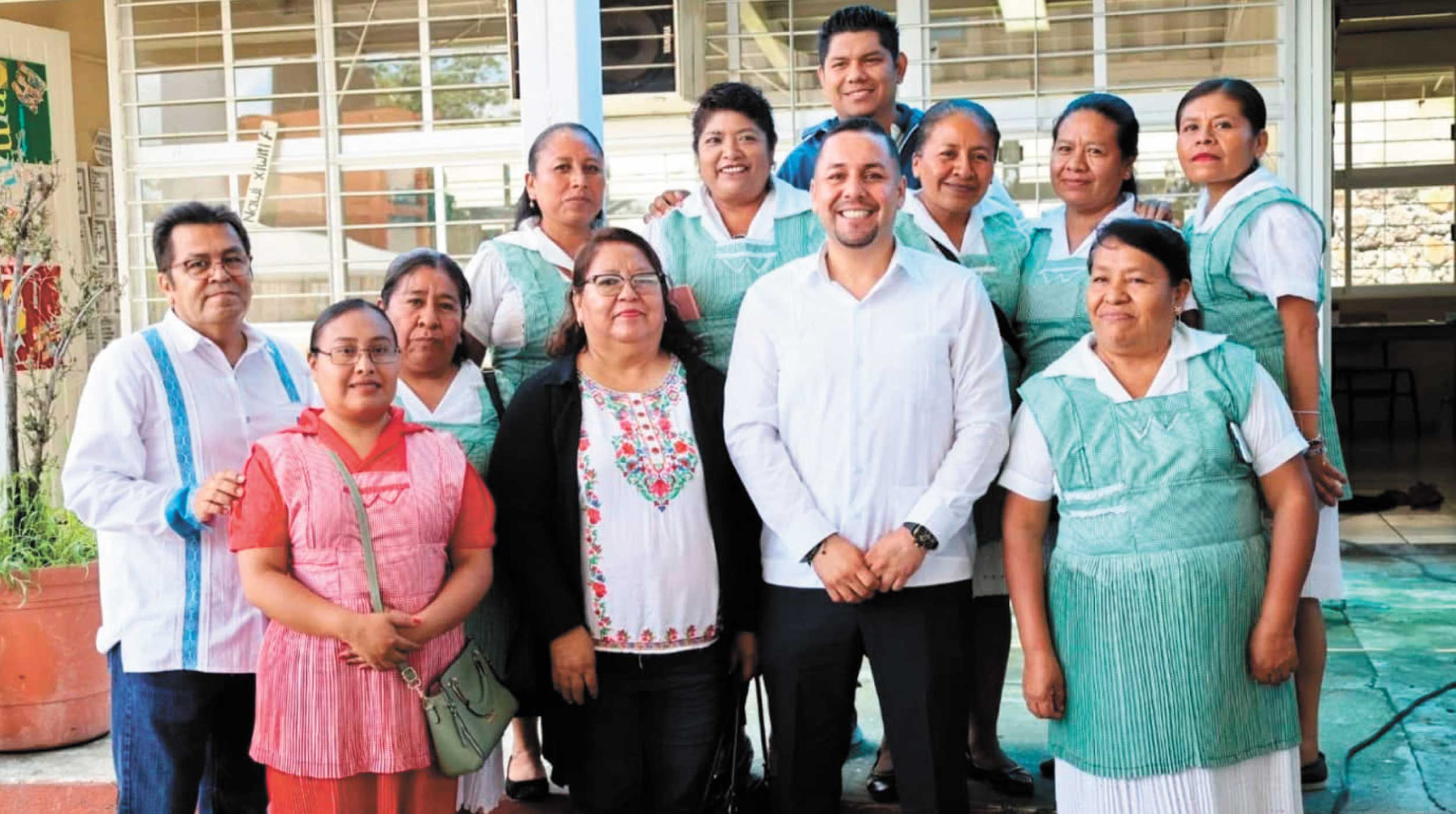 El presidente municipal de Temixco, Israel Piña Labra, junto con la gobernadora de Morelos, Margarita González Saravia, y el secretario de Educación Pública, Mario Delgado, en la celebración del Día Internacional de la Mujer Indígena, un evento que tuvo lugar en la comunidad de Cuentepec.