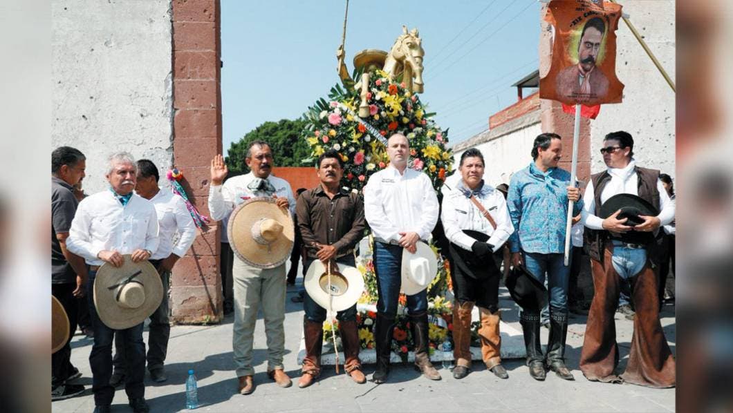 El candidato a la gubernatura por el Partido de la Revolución Democrática (PRD), Rodrigo Gayosso Cepeda, cabalgó junto con varios jinetes y acudió a la ex hacienda de Anenecuilco, en Ayala, para dejar una ofrenda en honor al 99 aniversario luctuoso del general Emiliano Zapata Salazar.