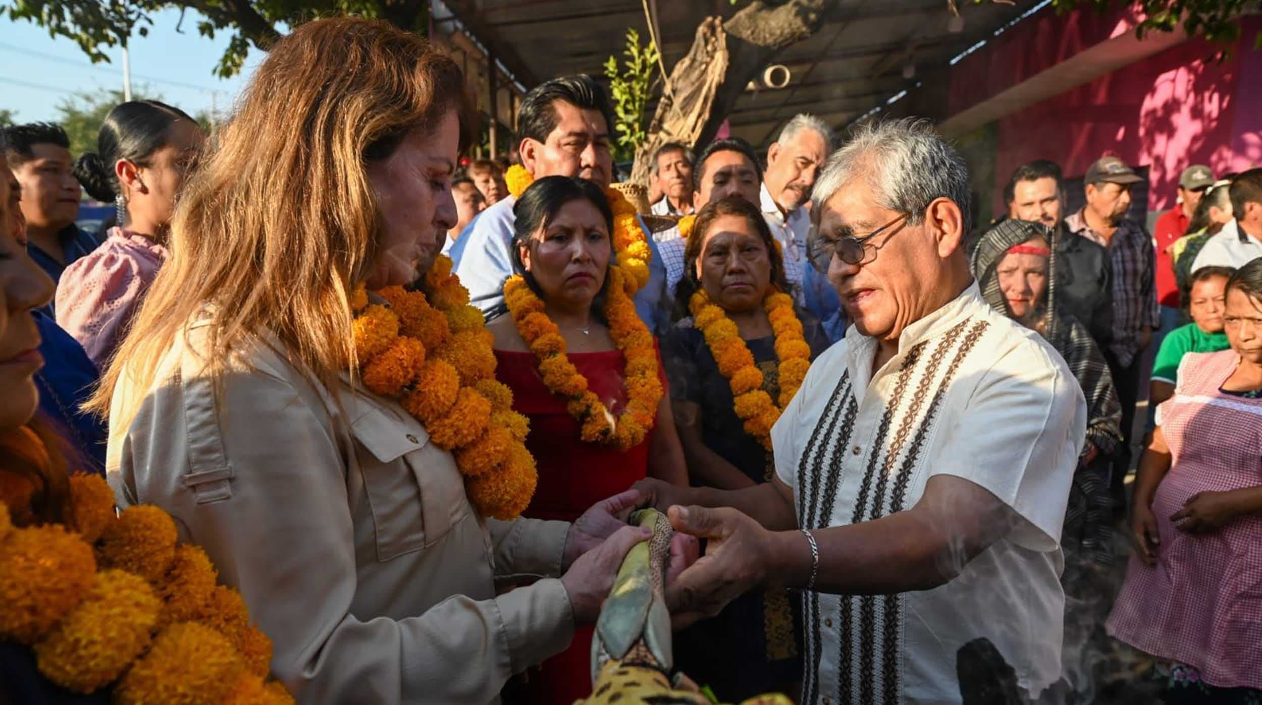 La primera mandataria estatal fue recibida por el edil entrante e integrantes del Señorío de los lugares sagrados de Alpuyeca, Xoxocotla y Tetelpa, quienes en un ritual prehispánico los perfumaron con sahumerio para limpiar el ambiente y generar las energías positivas que les permitan tomar mejores desiciones durante el desarrollo de sus gobiernos.
