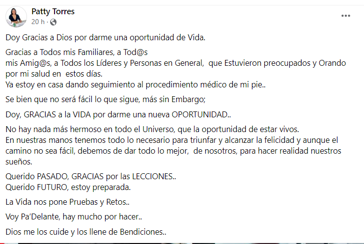 La Regidora de Cuernavaca, Patty Torres, fue dada de alta este miércoles, bajo medicación y cuidados para seguir recuperándose de la fractura expuesta que sufrió luego del accidente ocurrido en días pasados, donde el puente colgante del Paseo Ribereño se desplomó, causando lesiones a 15 personas.