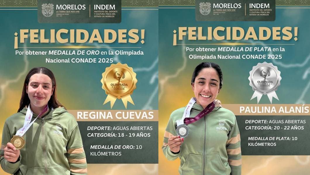 Yucatán.- El talento deportivo de Morelos volvió a brillar en la Olimpiada Nacional 2025, con sede en las playas de Yucatán, lo anterior, gracias a la destacada participación de las atletas Regina Cuevas Ortiz y Paulina Alanís Hernández, quienes subieron al podio en la prueba de 10 kilómetros en aguas abiertas.