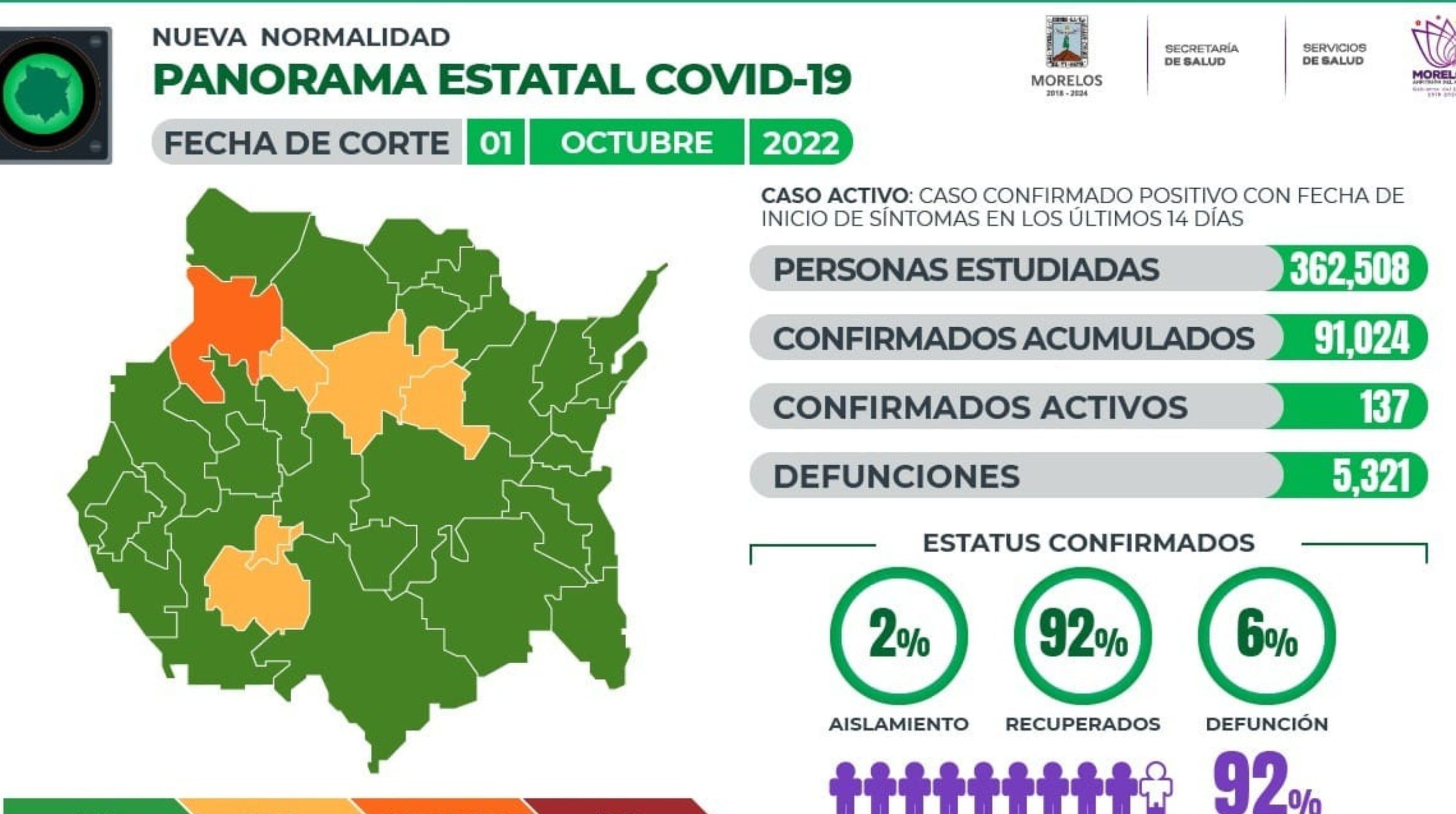 La Secretaría de Salud informa que a la fecha en Morelos se han estudiado 362 mil 508 personas, de las cuales se han confirmado 91 mil 024 con coronavirus COVID-19; 137 están activas y se han registrado 5 mil 321 defunciones.