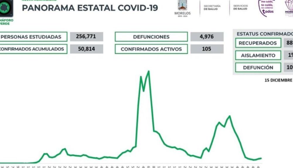 La Secretaría de Salud Morelos informa que a la fecha en Morelos se han estudiado 256 mil 771 personas, de las cuales se han confirmado 50 mil 814 con coronavirus COVID-19; 105 están activas y se han registrado 4 mil 976 defunciones.