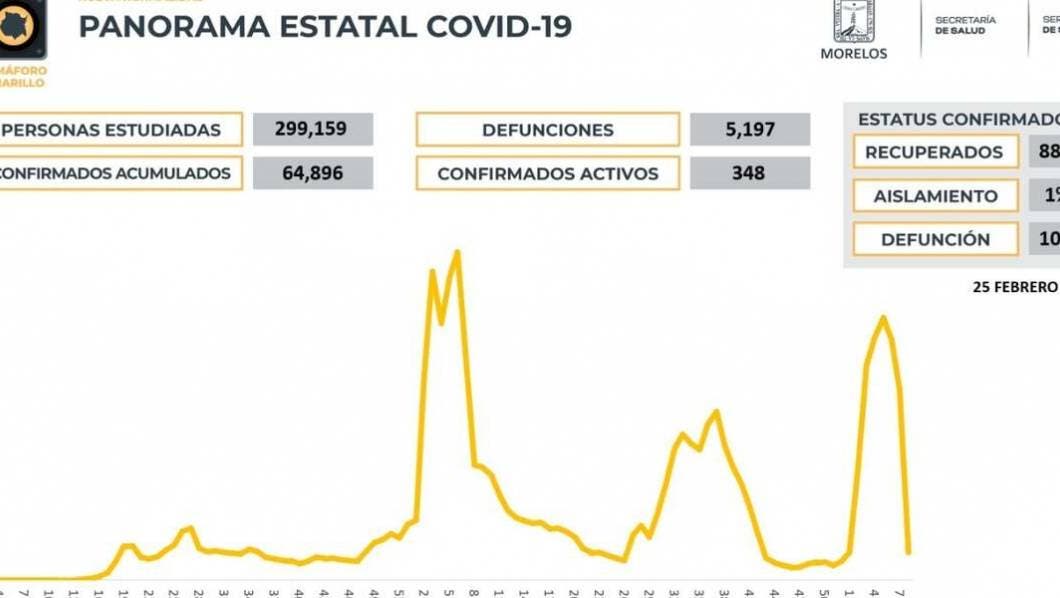 La Secretaría de Salud Morelos informa que a la fecha en Morelos se han estudiado 299 mil 159 personas, de las cuales se han confirmado 64 mil 896 con coronavirus COVID-19; 348 están activas y se han registrado 5 mil 197 defunciones.