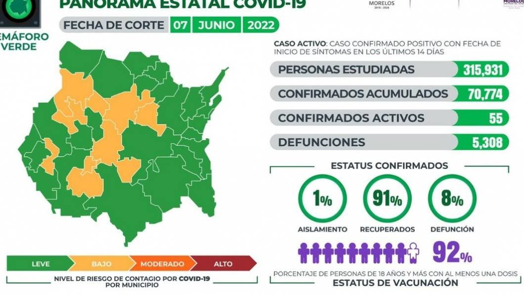 La Secretaría de Salud informa que a la fecha en Morelos se han estudiado 315 mil 931 personas, de las cuales se han confirmado 70 mil 774 con coronavirus COVID-19; 55 están activas y se han registrado 5 mil 308 defunciones.