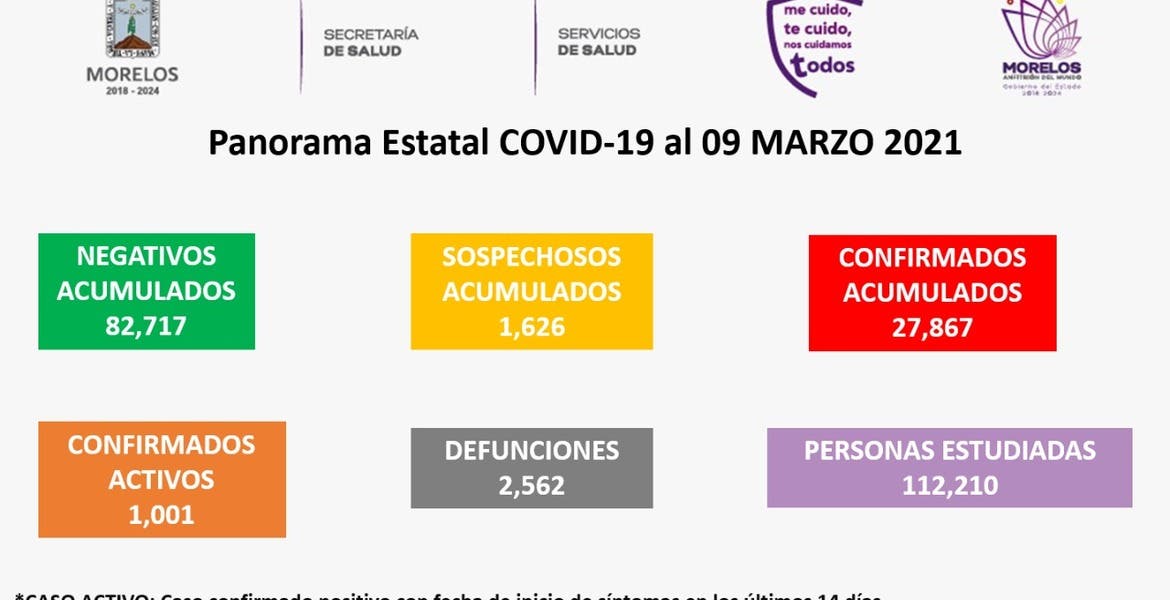 La Secretaría de Salud informa que a la fecha en Morelos se han estudiado 112 mil 210 personas, de las cuales se han confirmado 27 mil 867 con coronavirus COVID-19; mil 001 están activas, descartado 82 mil 717 y están como sospechosos mil 626; se han registrado 2 mil 562 defunciones.
