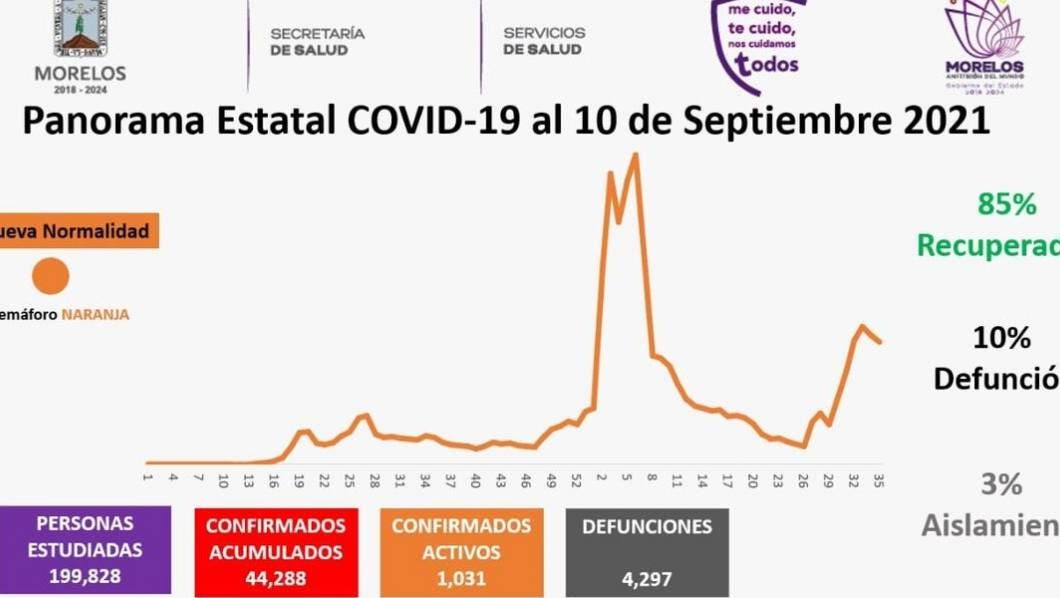 La Secretaría de Salud informa que a la fecha en Morelos se han estudiado 199 mil 828 personas, de las cuales se han confirmado 44 mil 288 con coronavirus COVID-19; mil 031 están activas y se han registrado 4 mil 297 defunciones.
