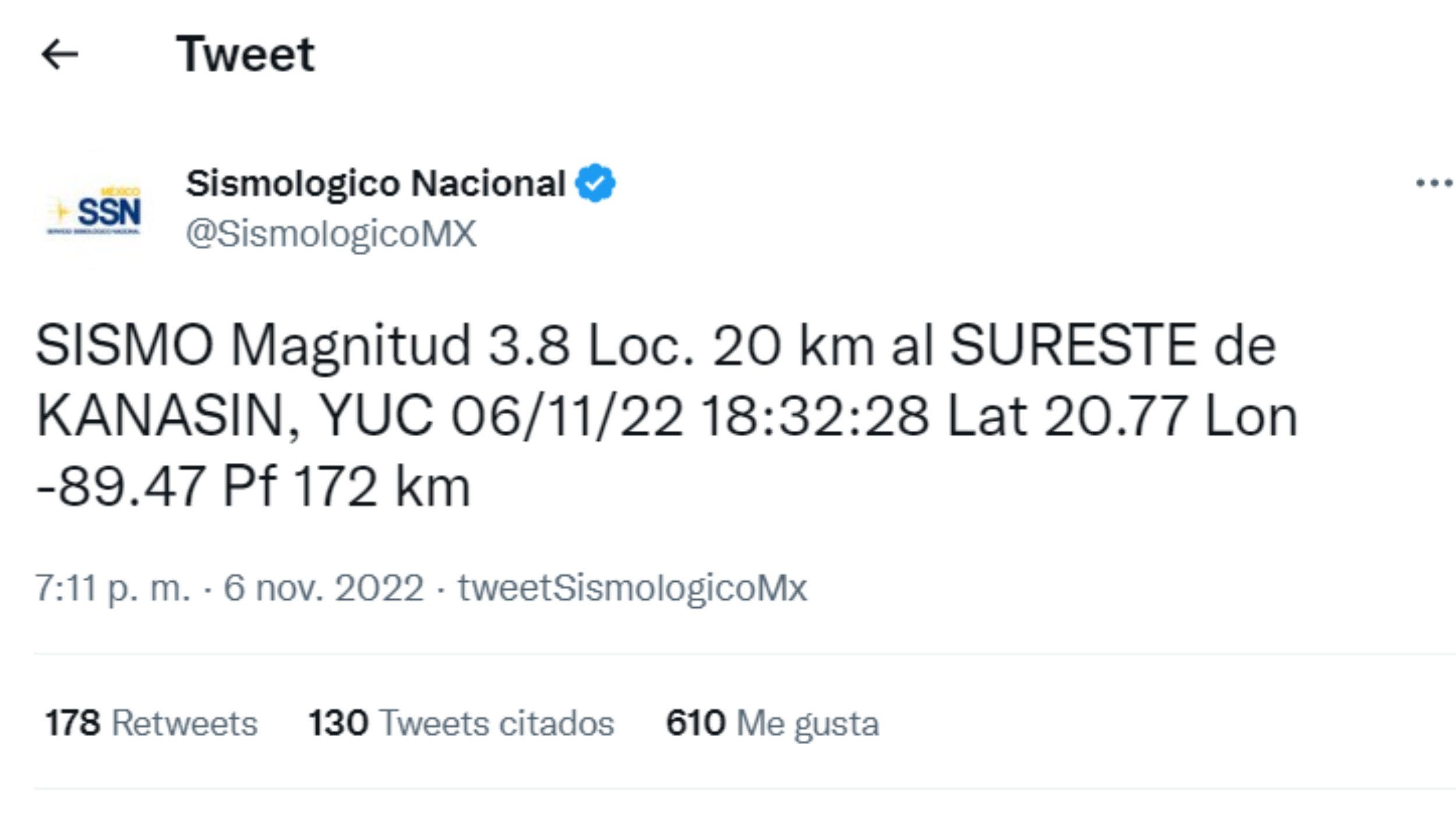 Según el reporte, el epicentro del movimiento telúrico se registró a 20 kilómetros al sureste del municipio de Kanasín, a las 18:32 horas; la profundidad del sismo, indica, fue de 172 kilómetros.