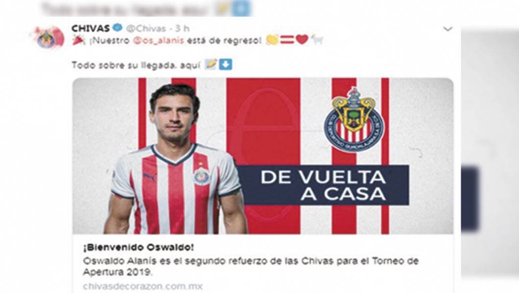 “El Club Deportivo Guadalajara llegó a un arreglo con Oswaldo Alanís para que, tras militar un año en el futbol de España, vuelva a defender los colores del equipo más representativo e importante de México a partir del Apertura 2019”, cita el comunicado del club.