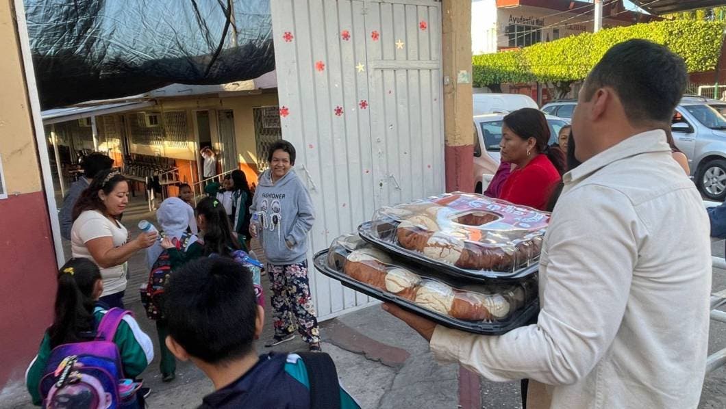 En varias escuelas, como la ‘Benito Juárez’, ubicada en la colonia Tlahuapan de Jiutepec, maestras y maestros se organizaron para que los estudiantes pudieran partir la tradicional rosca de reyes y acompañarla de un chocolate caliente.
