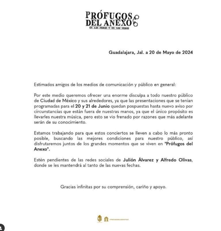 Uno de los eventos más esperados de este año en la capital mexicana es el concierto de "Prófugos del Anexo", la unión musical de Alfredo Olivas y Julión Álvarez. Tras la cancelación de su presentación prevista para mayo pasado, finalmente han confirmado nuevas fechas y recintos para deleitar a sus seguidores en la Ciudad de México.