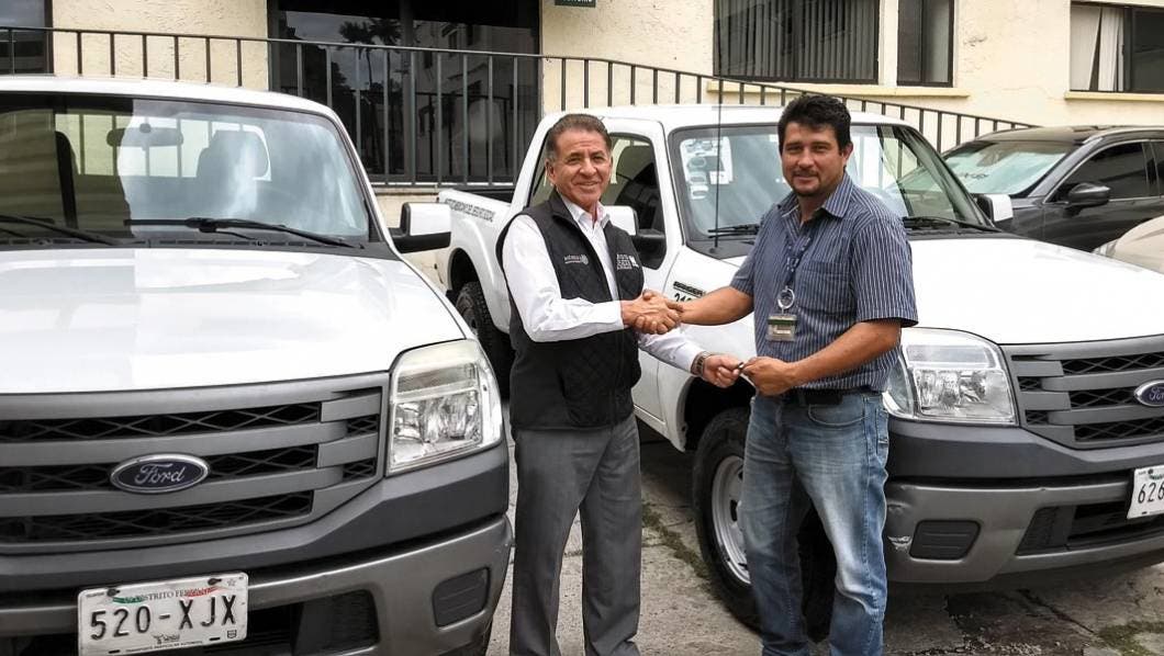 El delegado del IMSS, Víctor Manuel Vázquez Zárate, entregó las llaves de unidades Ford pick up 2011, como parte del programa de reposición de vehículos, para fortalecer la función de apoyo administrativo que se realiza en la sede delegacional. Foto: Especial / DDM
