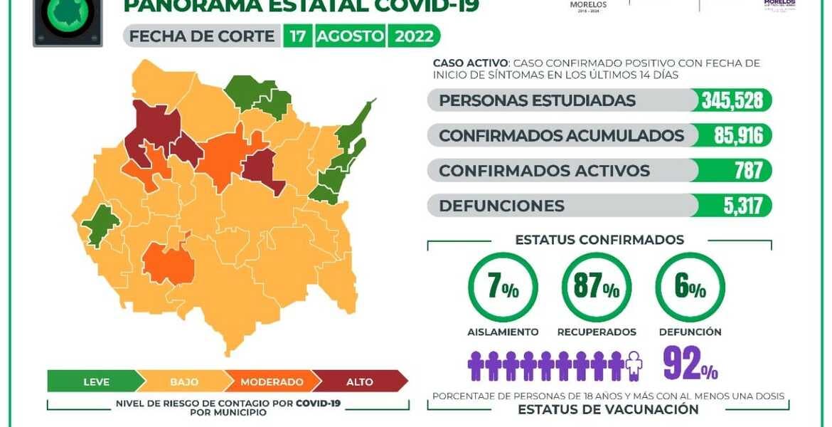 La Secretaría de Salud informa que a la fecha en Morelos se han estudiado 345 mil 528 personas, de las cuales se han confirmado 85 mil 916 con coronavirus COVID-19; 787 están activas y se han registrado 5 mil 317 defunciones.