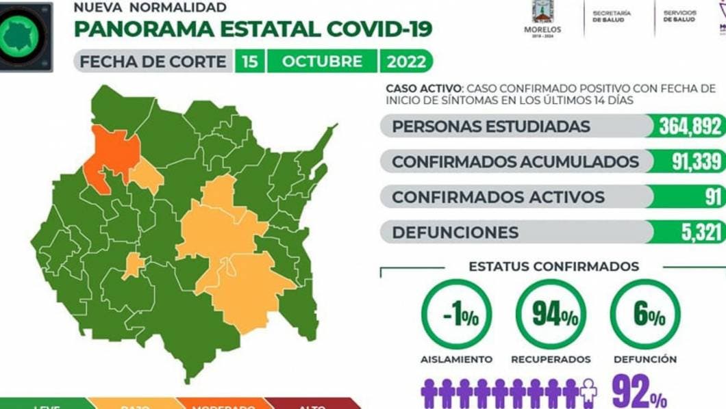 La Secretaría de Salud informa que a la fecha en Morelos se han estudiado 364 mil 892 personas, de las cuales se han confirmado 91 mil 339 con coronavirus COVID-19; 91 están activas y se han registrado 5 mil 321 defunciones.