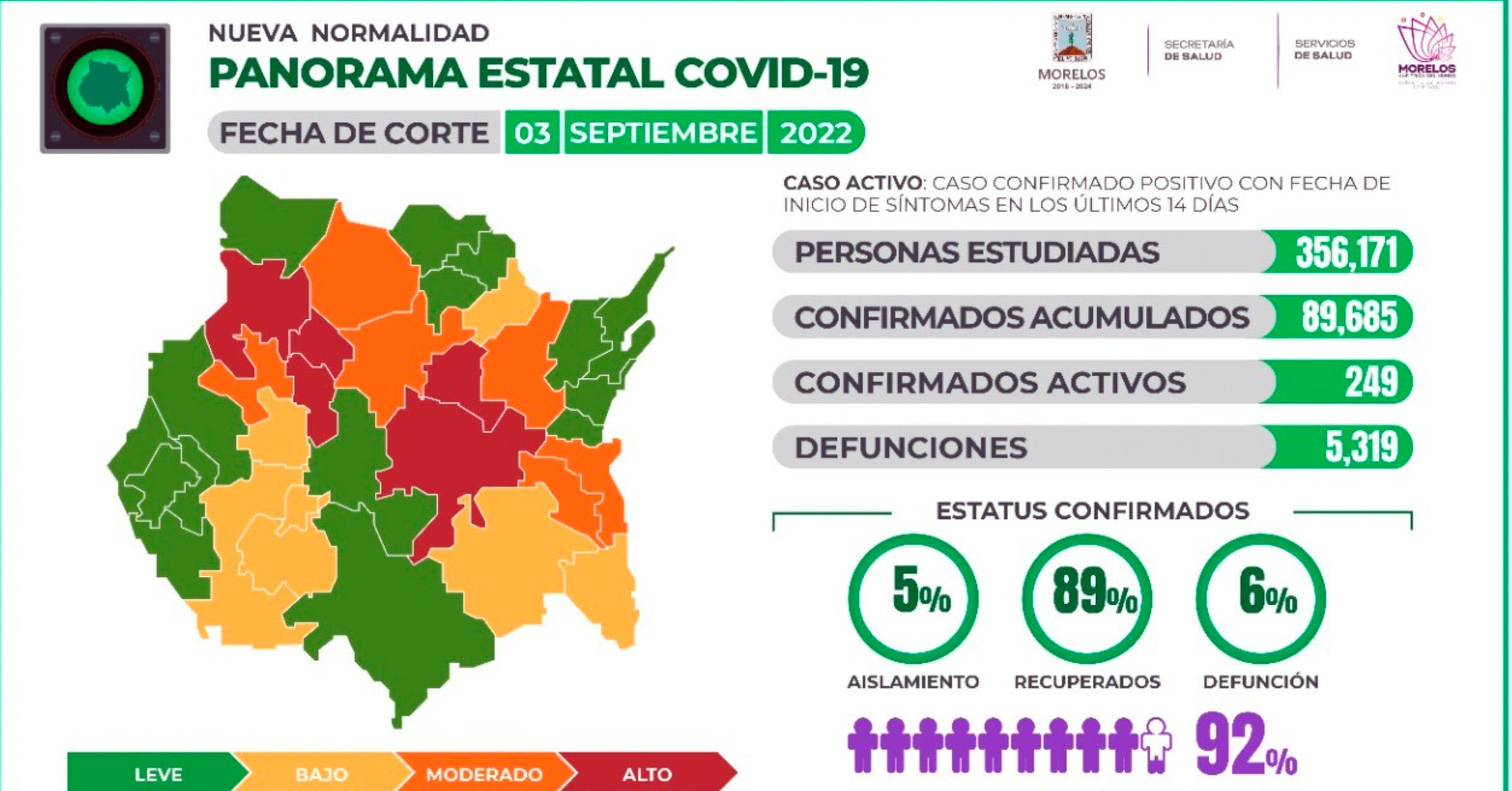 La Secretaría de Salud informa que a la fecha en Morelos se han estudiado 356 mil 171 personas, de las cuales se han confirmado 89 mil 685 con coronavirus COVID-19; 249 están activas y se han registrado 5 mil 319 defunciones.