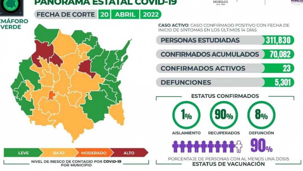 La Secretaría de Salud informa que a la fecha en Morelos se han estudiado 311 mil 830 personas, de las cuales se han confirmado 70 mil 082 con coronavirus COVID-19; 23 están activas y se han registrado 5 mil 301 defunciones.