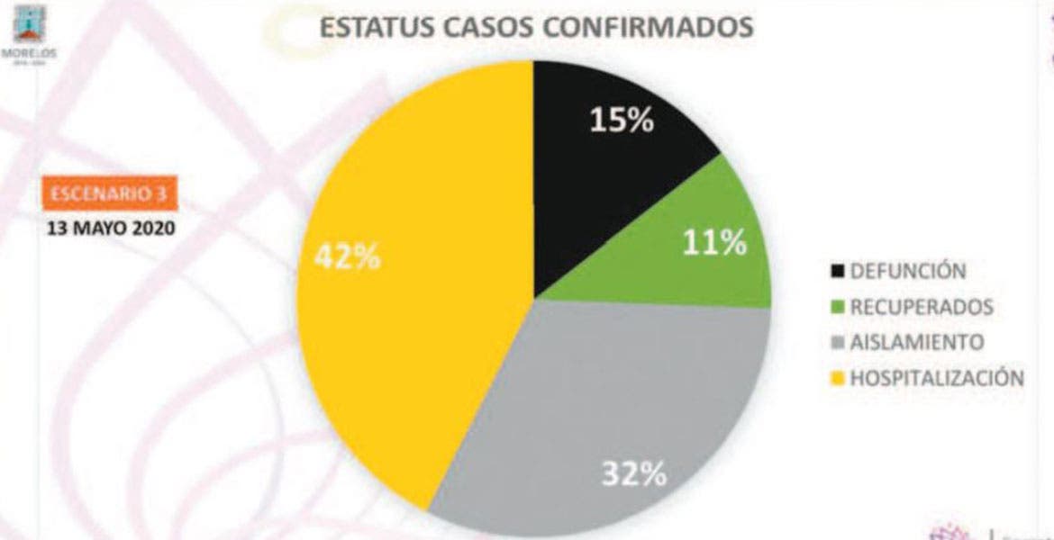 Mientras que los fallecimientos suman 135. De acuerdo al estatus de casos confirmados, de los 930 un 42 por ciento se encuentra en hospitalización, un 32 por cierto permanece en aislamiento domiciliario, mientras que el 11 por ciento por ciento se ha recuperado. Cantú Cuevas destacó que después de muchas semanas el porcentaje de personas recuperadas se ha incrementado, después de mantenerse entre el seis y siete por ciento; pero también lamentó que un 15 por ciento ha fallecido. Los municipios con mayor incidencia de casos son Cuernavaca, Cuautla, Jiutepec, Jojutla, Temixco, Xochitepec, Xoxocotla, Emiliano Zapata, Yautepec y Zacatepec.