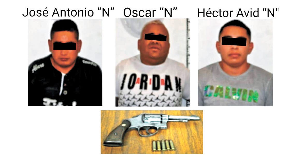Los detenidos son José Antonio, de 27 años; Oscar, de 37; y Héctor Avid, de 19 años, quienes fueron remitidos al Ministerio Público por robo calificado y violación a la Ley Federal de Armas de Fuego y
