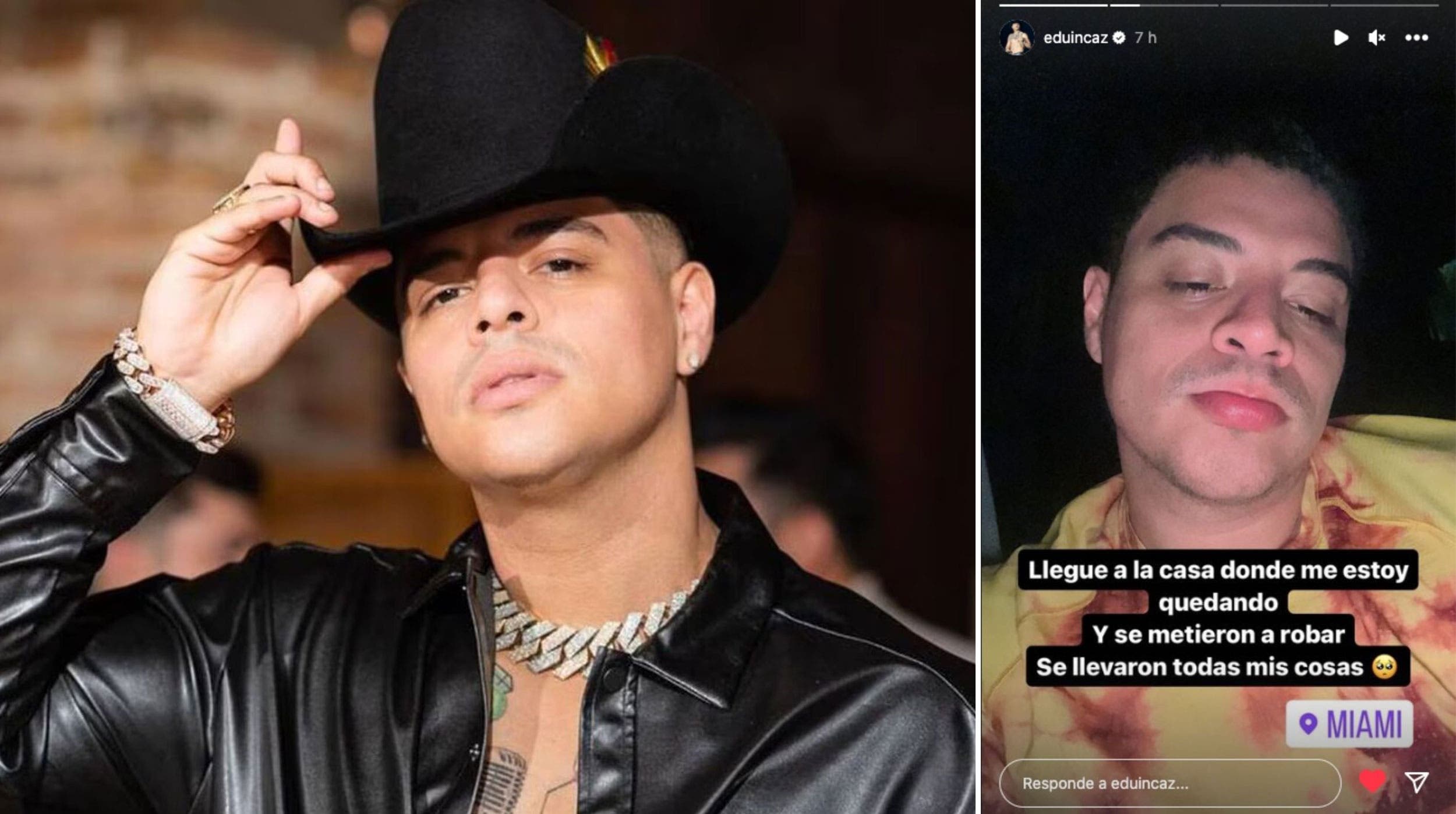 El robo ocurrió la noche del viernes 22 de septiembre, cuando Eduin Caz subió a sus historias de Instagram una foto en la que se mostraba visiblemente afectado, con un mensaje que decía: "Llegué a la casa donde me estoy quedando y se metieron a robar, se llevaron todas mis cosas". En la publicación, también compartió la ubicación de la ciudad de Miami.