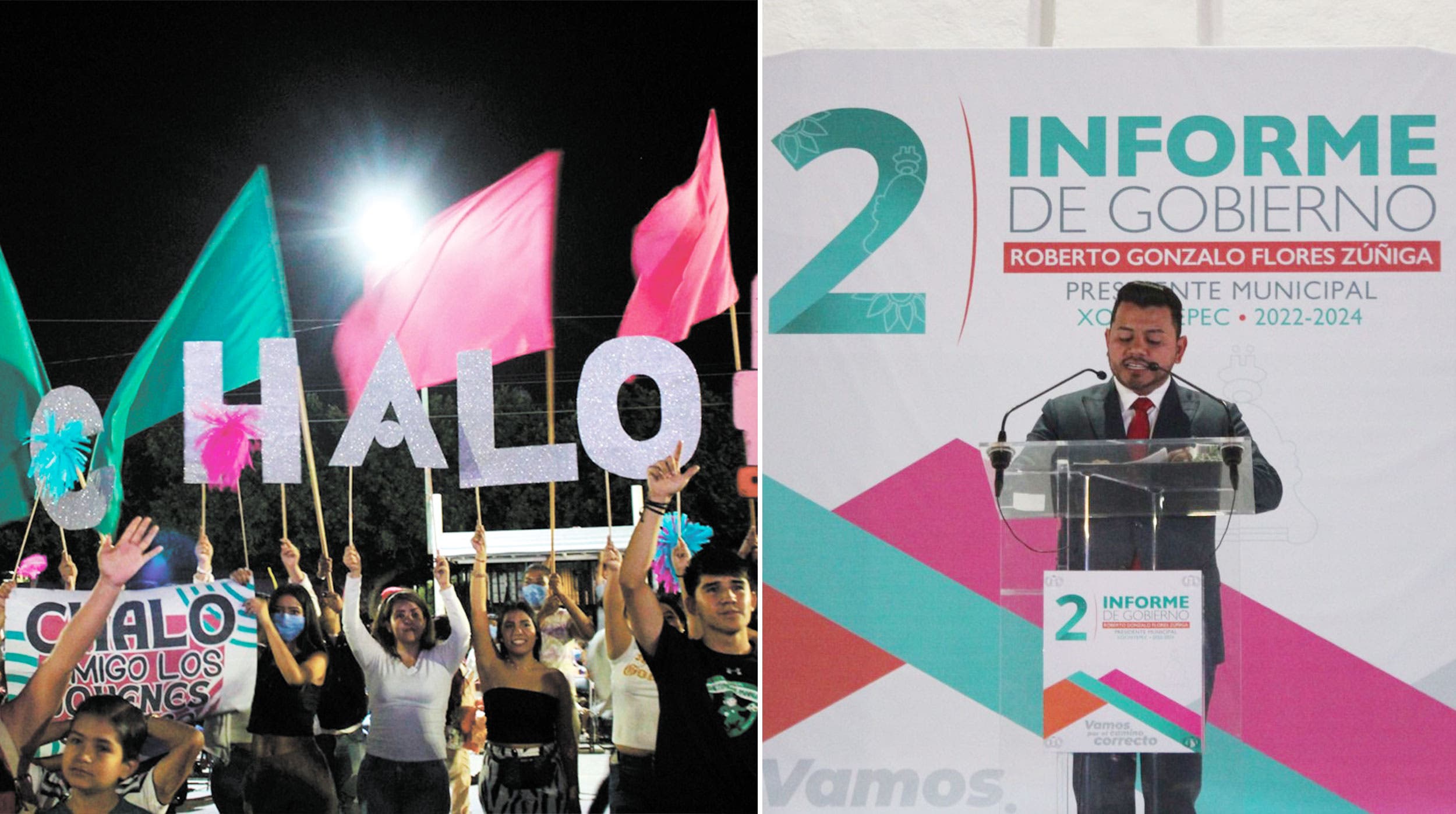 Ante cientos de xochitepenses, el presidente municipal Roberto ‘Chalo’ Flores Zuñiga rindió su Segundo Informe de Gobierno, entre pancartas con leyendas de apoyo y porras.