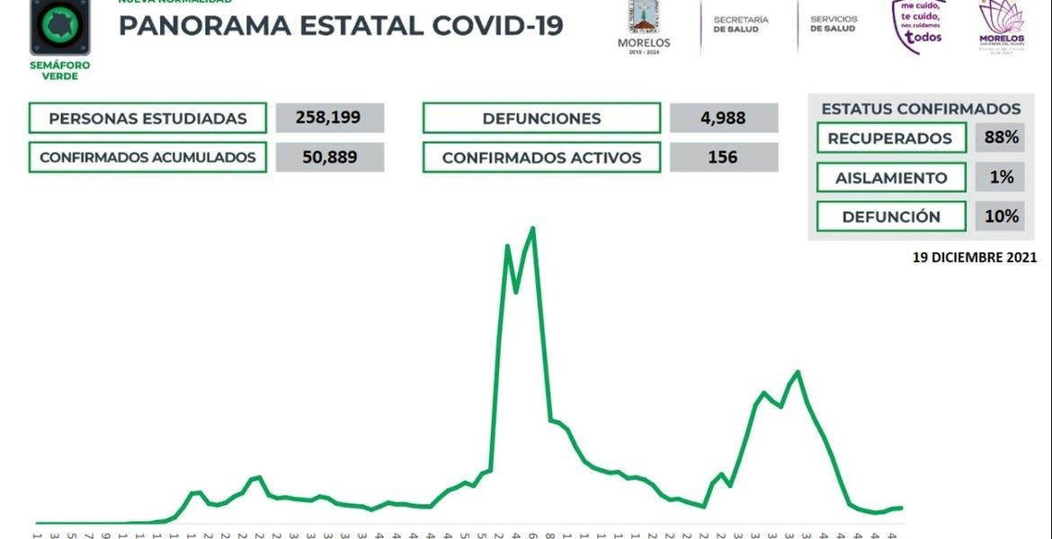 La Secretaría de Salud informa que a la fecha en Morelos se han estudiado 258 mil 199 personas, de las cuales se han confirmado 50 mil 889 con coronavirus COVID-19; 156 están activas y se han registrado 4 mil 988 defunciones.