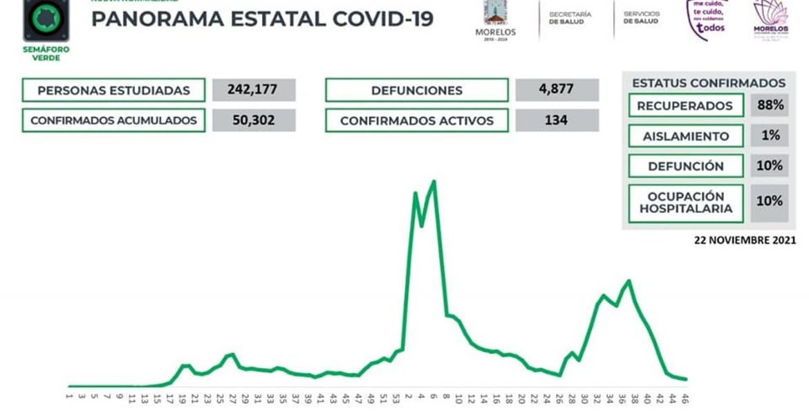 La Secretaría de Salud Morelos informa que a la fecha en Morelos se han estudiado 242 mil 177 personas, de las cuales se han confirmado 50 mil 302 con coronavirus COVID-19; 134 están activas y se han registrado 4 mil 877 defunciones.