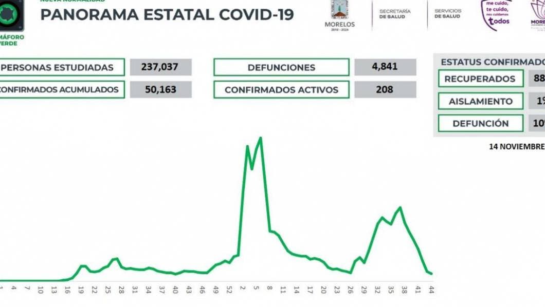 La Secretaría de Salud informa que a la fecha en Morelos se han estudiado 237 mil 037 personas, de las cuales se han confirmado 50 mil 163 con coronavirus COVID-19; 208 están activas y se han registrado 4 mil 841 defunciones.