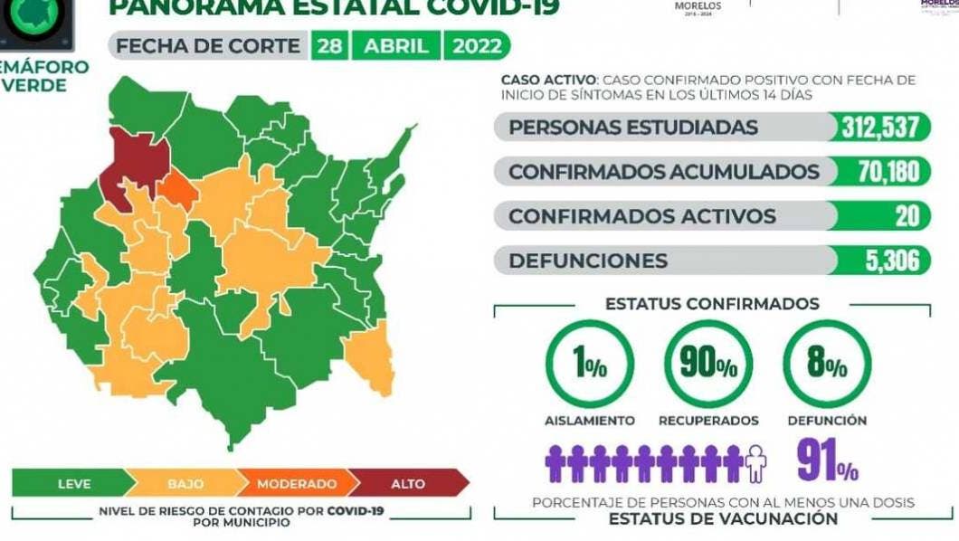 La Secretaría de Salud Morelos informa que a la fecha en Morelos se han estudiado 312 mil 537 personas, de las cuales se han confirmado 70 mil 180 con coronavirus COVID-19; 20 están activas y se han registrado 5 mil 306 defunciones.