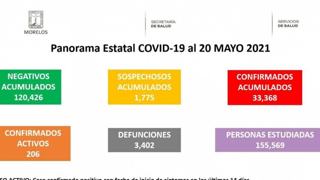 La Secretaría de Salud informa que a la fecha en Morelos se han estudiado 155 mil 569 personas, de las cuales se han confirmado 33 mil 368 con coronavirus COVID-19; 206 están activas, descartado 120 mil 426 y están como sospechosos mil 775; se han registrado 3 mil 402 defunciones.