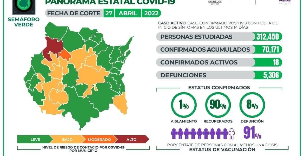 La Secretaría de Salud Morelos informa que a la fecha en Morelos se han estudiado 312 mil 450 personas, de las cuales se han confirmado 70 mil 171 con coronavirus COVID-19; 18 están activas y se han registrado 5 mil 306 defunciones.