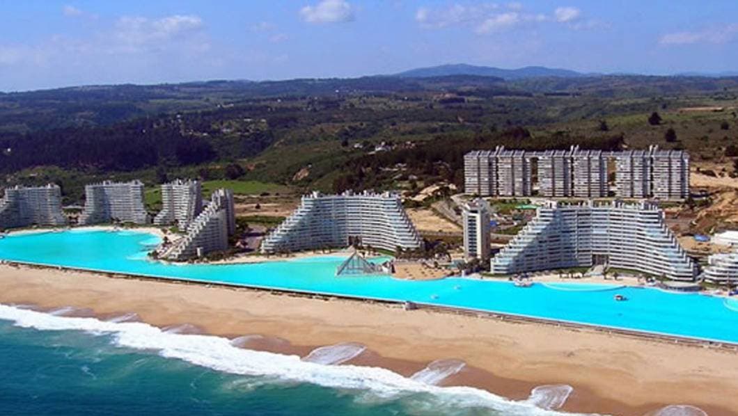 La enorme piscina, que más bien es una laguna hecha por el hombre se encuentra a mitad de la costa del país en el Pacífico, en la ciudad de Algarrobo, y se llena con unos 250 millones de litros de agua.