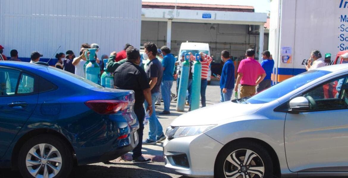 Este día se formaron largas filas para conseguir oxígeno medicinal, para pacientes enfermos de COVID-19 afuera de la empresa Infra, ubicada en CIVAC.
