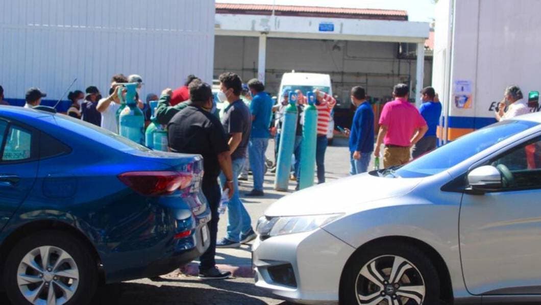 Este día se formaron largas filas para conseguir oxígeno medicinal, para pacientes enfermos de COVID-19 afuera de la empresa Infra, ubicada en CIVAC.