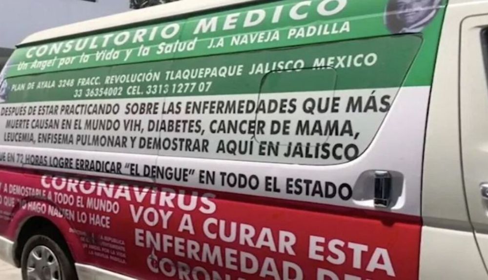 Con megáfono en mano, policías municipales de Tlaquepaque, en Jalisco, detuvieron a Juan Ángel, de 76 años, que vendía a bordo de una van un falso tratamiento para curar el coronavirus COVID-19.