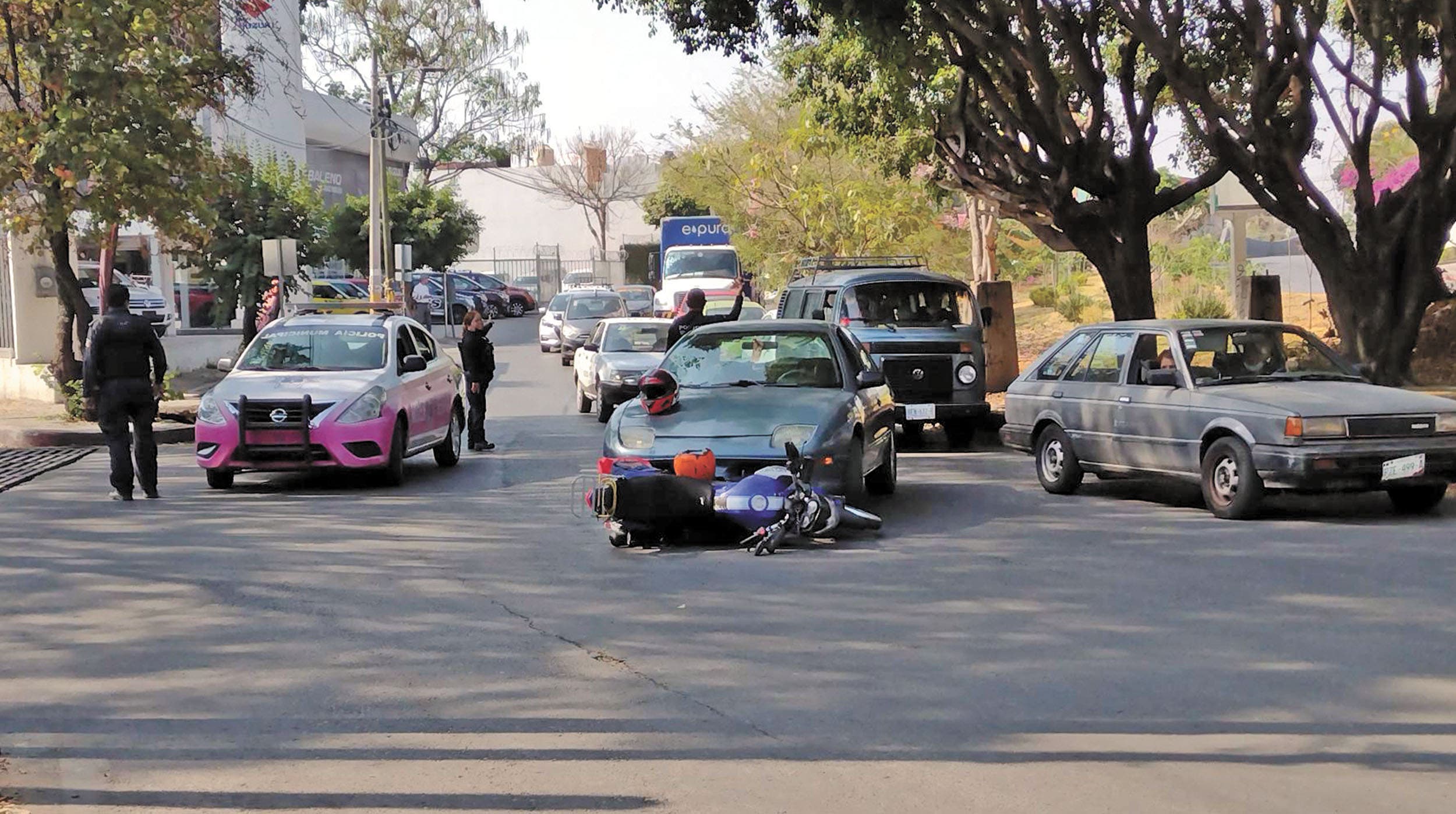 Al tratar de incorporarse hacia la Avenida Teopanzolco, el par de motociclistas fue atropellado por un auto Pontiac Sunfire, color azul, con permiso para circular, que era guiado por un hombre.