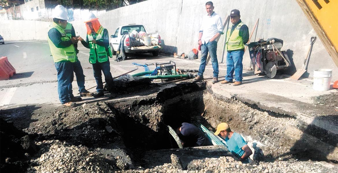 Bache. SCT y SAPAC buscan la fuga de agua que causó el hundimiento en el Paso Express, en el tramo que corresponde a la colonia Chipitlán.