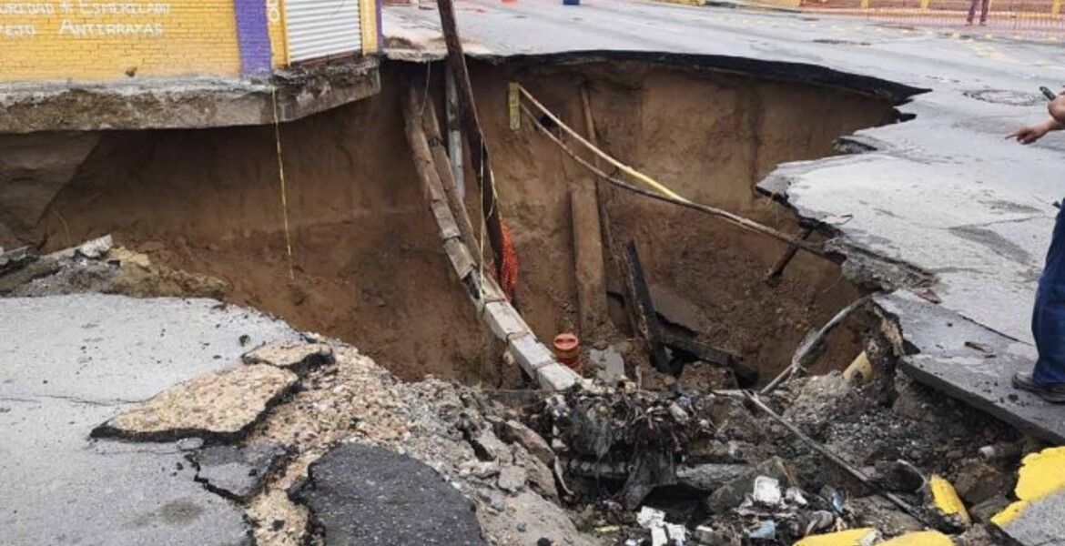 Protección Civil Municipal informó que este hundimiento de aproximadamente 20 metros de diámetro, se generó tras la ruptura de una tubería de agua que cuenta con 50 años de antigüedad.