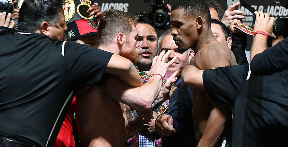Tras sobreponerse sin complicación a la báscula, Canelo Álvarez y Daniel Jacobs estuvieron a punto de llegar a los golpes en el 'cara a cara', lo que provocó el enojo del campeón mexicano.