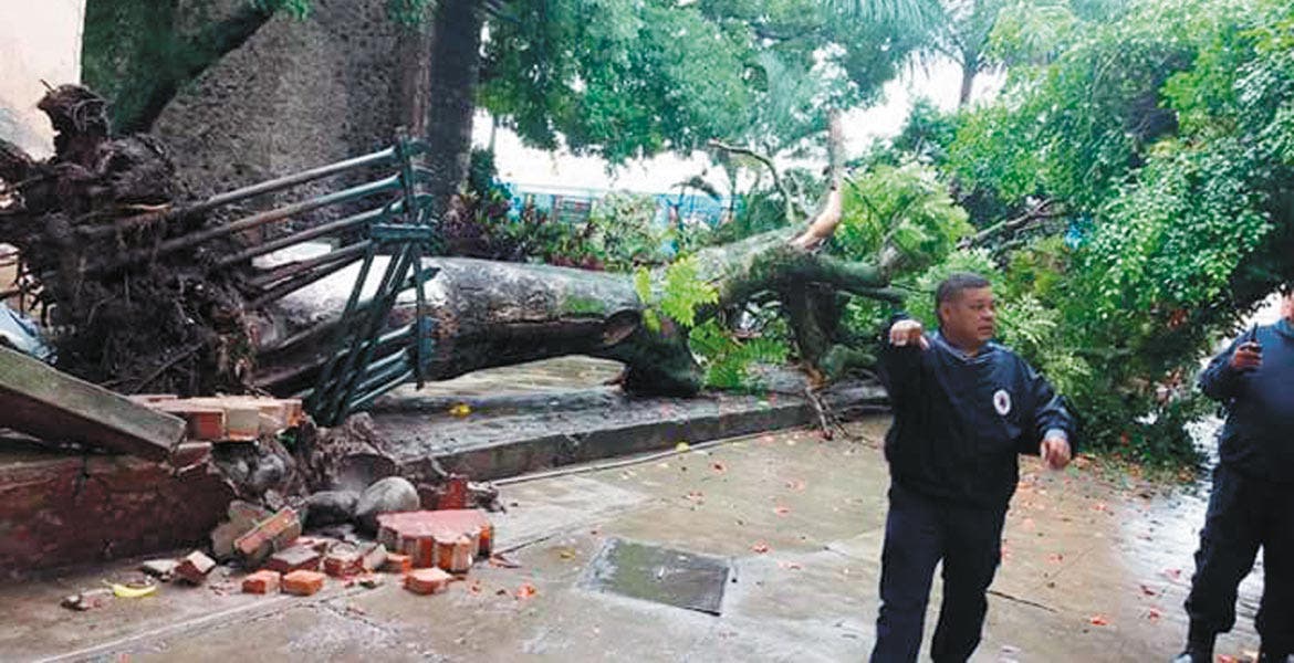 Una barda ubicada a espaldas del parque del antiguo tren, en pleno Centro de Cuautla, colapsó presuntamente debido al reblandecimiento de la estructura por las lluvias de los últimos días. Además, en la misma zona se cayó un árbol, por lo que personal de Protección Civil acordonó el área.