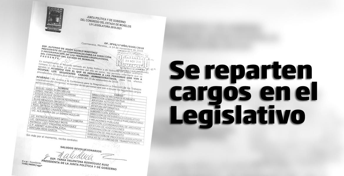 CUERNAVACA, MORELOS.- Tras 15 días de jaloneo y negociación entre diputados de la LIV Legislatura, finalmente acordaron repartirse de forma equitativa los cargos que hay en el Congreso del Estado y en los que designaron a gente de su confianza.
